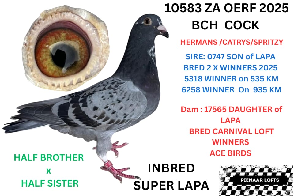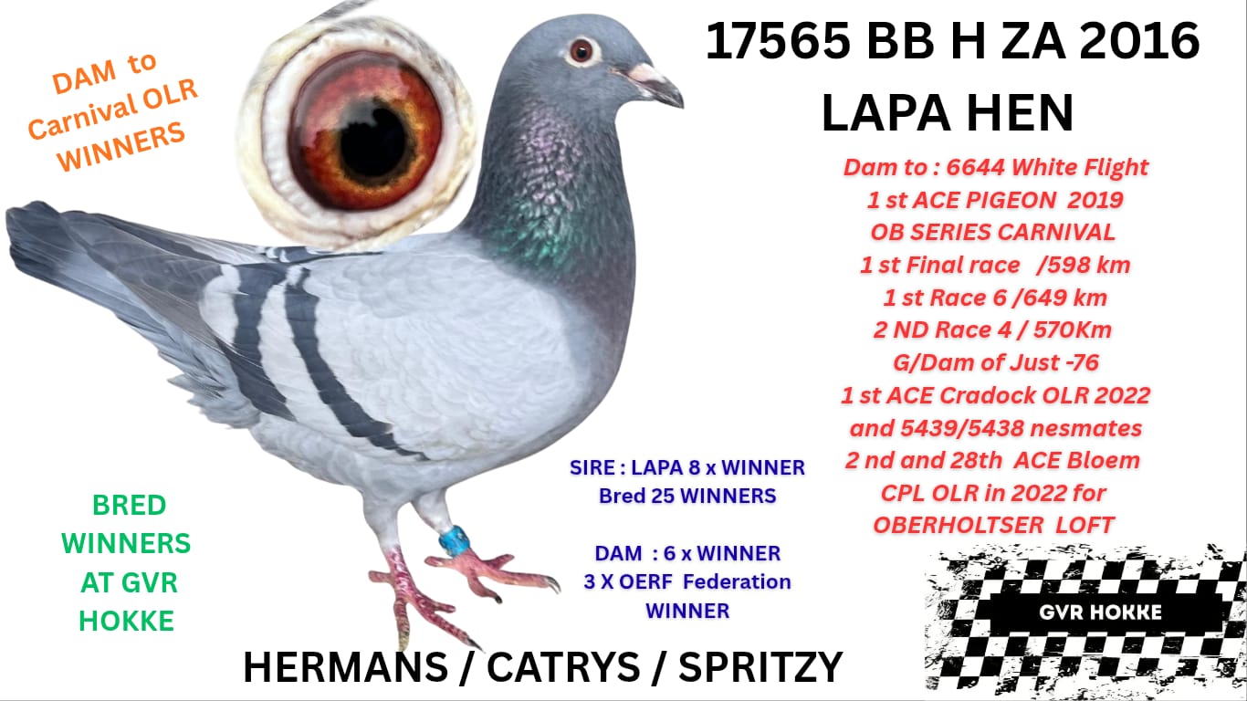 SIRE & G/ SIRE AND G/G SIRE TO DINOKENG BAKKIE WINNER 2019 /KNOCK OUT WINNER AND FINAL WINNER 2020 CARNIVAL LOFTS WINNER / DIAZ LOFTS WINNER / GPU UNION WINNER / OERF GOLD / BRONZE / SILVER MEDALS AS WELL 1ST ACE CRADOCK ACE PIGEON / WINNING BLOOD FOR GYS LOUW / GVR LOFTS / OBERHOLTSER LOFTS / HENNIE MOLL /STEPHEN MANSFIELD / 2 DERBY WINNERS FOR HENNIE OOSTHUIZEN / GPU UNION WINNER FOR MYSELF