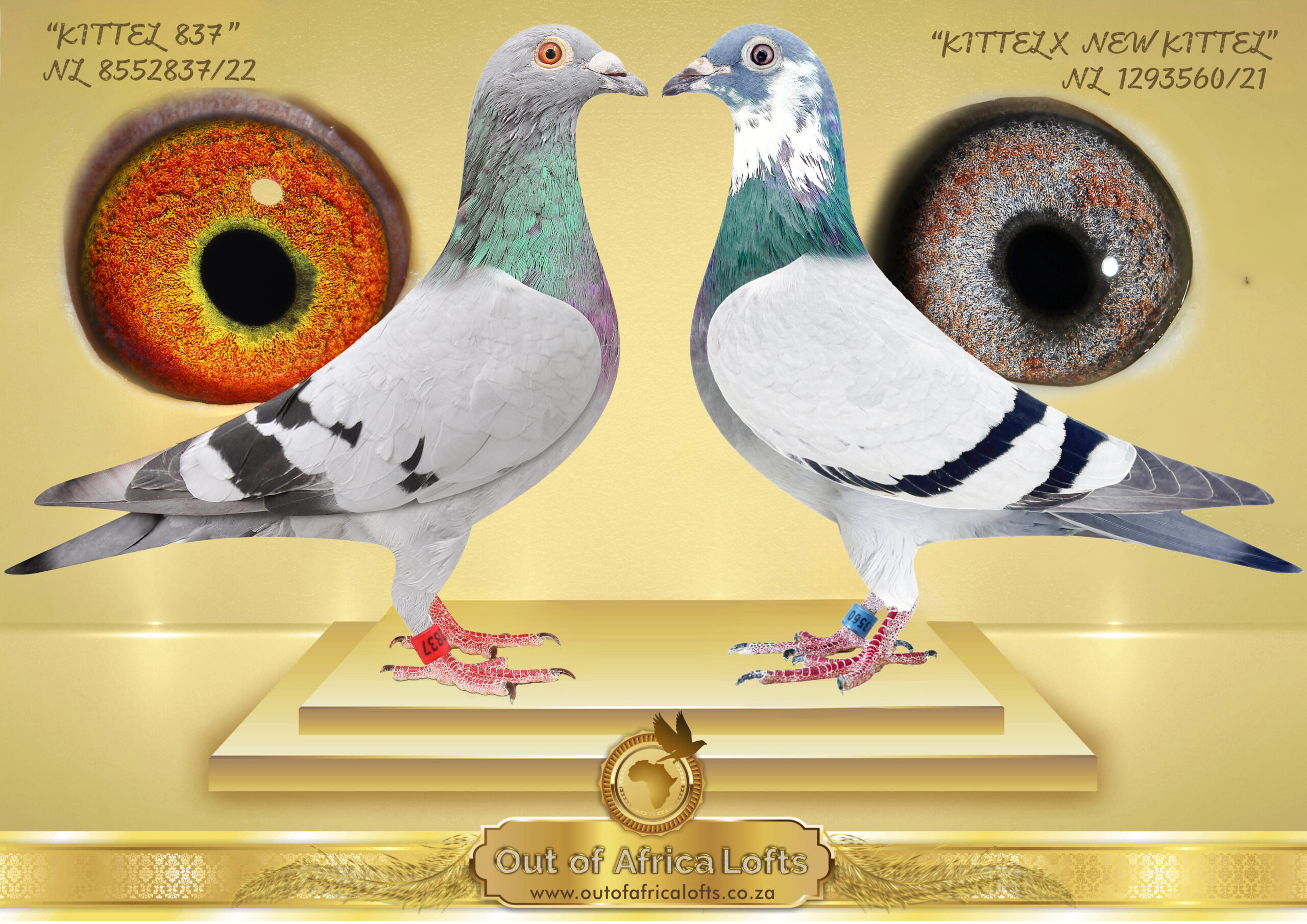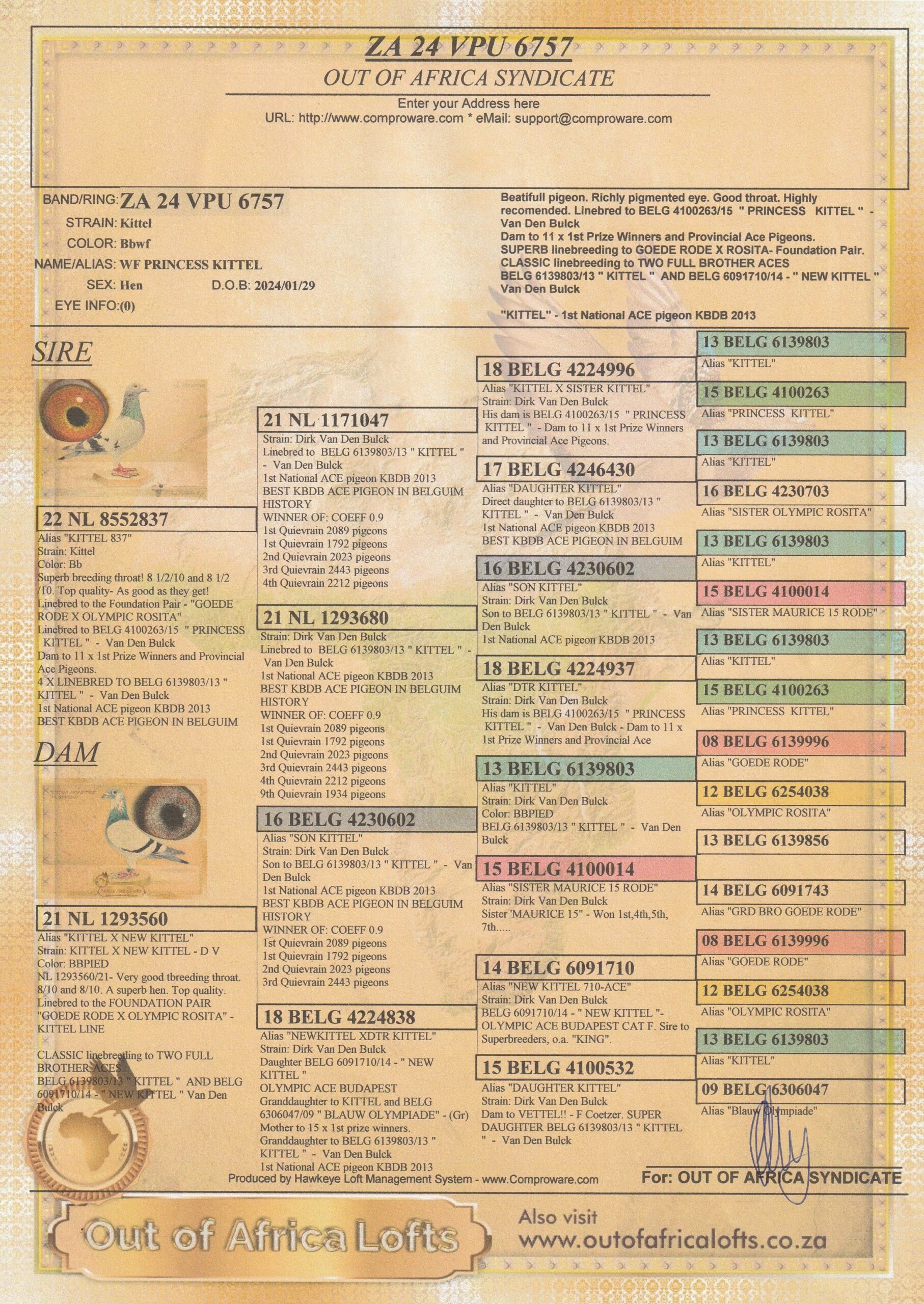 LOT 1: ZA VPU 6757/24 (H) – “PIED KITTEL “ – Breeding ready. A beautifull pigeon!!! Well ventilated wing. RICHLY pigmented eye. HIGHLY RECOMMENDED!!!! Linebred to KITTEL GOEDE RODE X OLYMPIC ROSITA! Linebred to BELG 4100263/15 ” PRINCESS KITTEL ” – Van Den Bulck Dam to 11 x 1st Prize Winners and Provincial Ace Pigeons. SUPERB linebreeding to GOEDE RODE X ROSITA- Foundation Pair. CLASSIC linebreeding to TWO FULL BROTHER ACES BELG 6139803/13 ” KITTEL ” AND BELG 6091710/14 – ” NEW KITTEL ” Van Den Bulck “KITTEL” – 1st National ACE pigeon KBDB 2013 BEST KBDB ACE PIGEON IN BELGUIM HISTORY WINNER OF: COEFF 0.9 BELG 6091710/14 – ” NEW KITTEL ” OLYMPIC ACE BUDAPEST 1st – Quievrain 1 371 pigeons 3rd – Quievrain 1 993 pigeons 8th – Quievrain 1 571 pigeons 26th – Quievrain 2 126 pigeons – SEE PEDIGREE – THIS IS SUPER !!!!