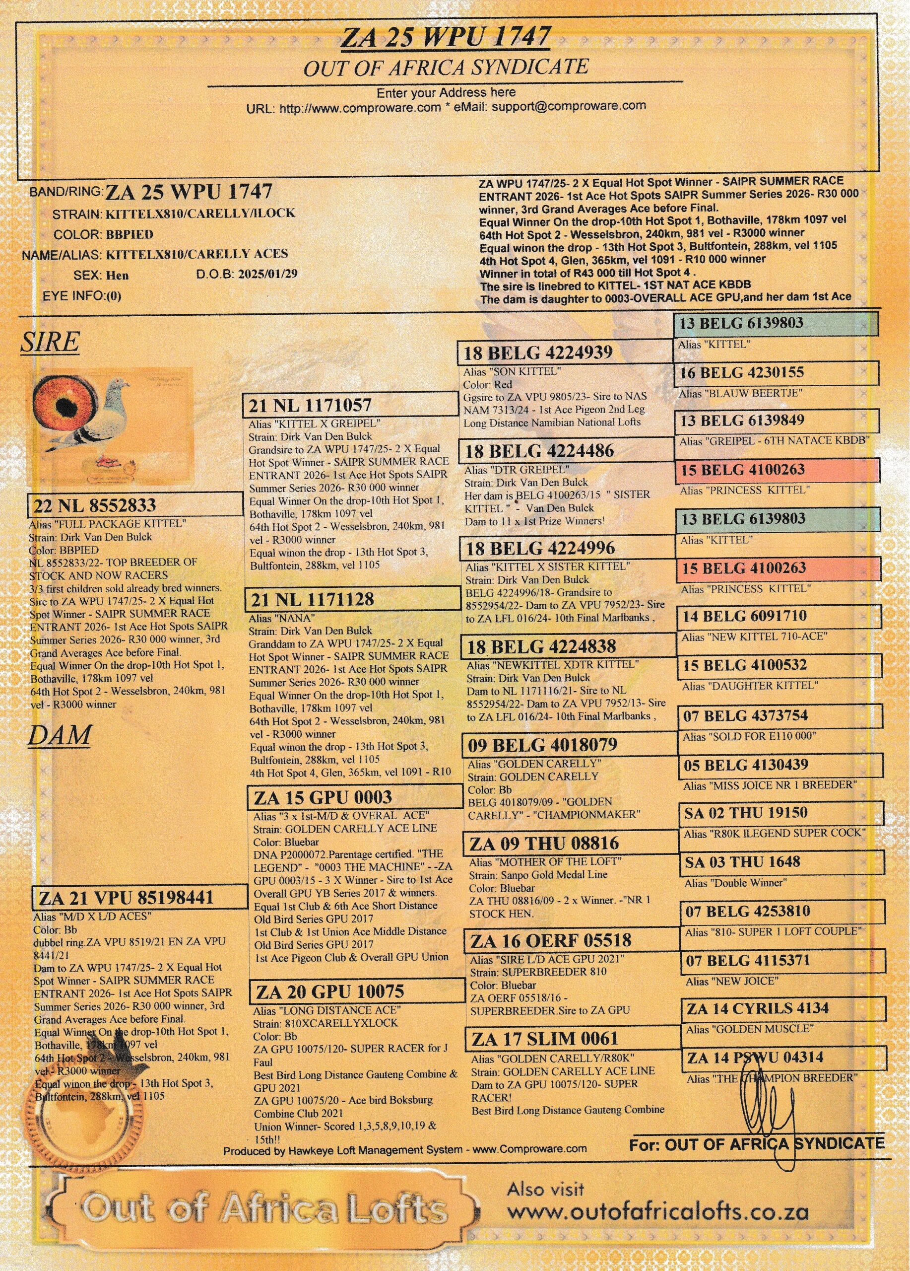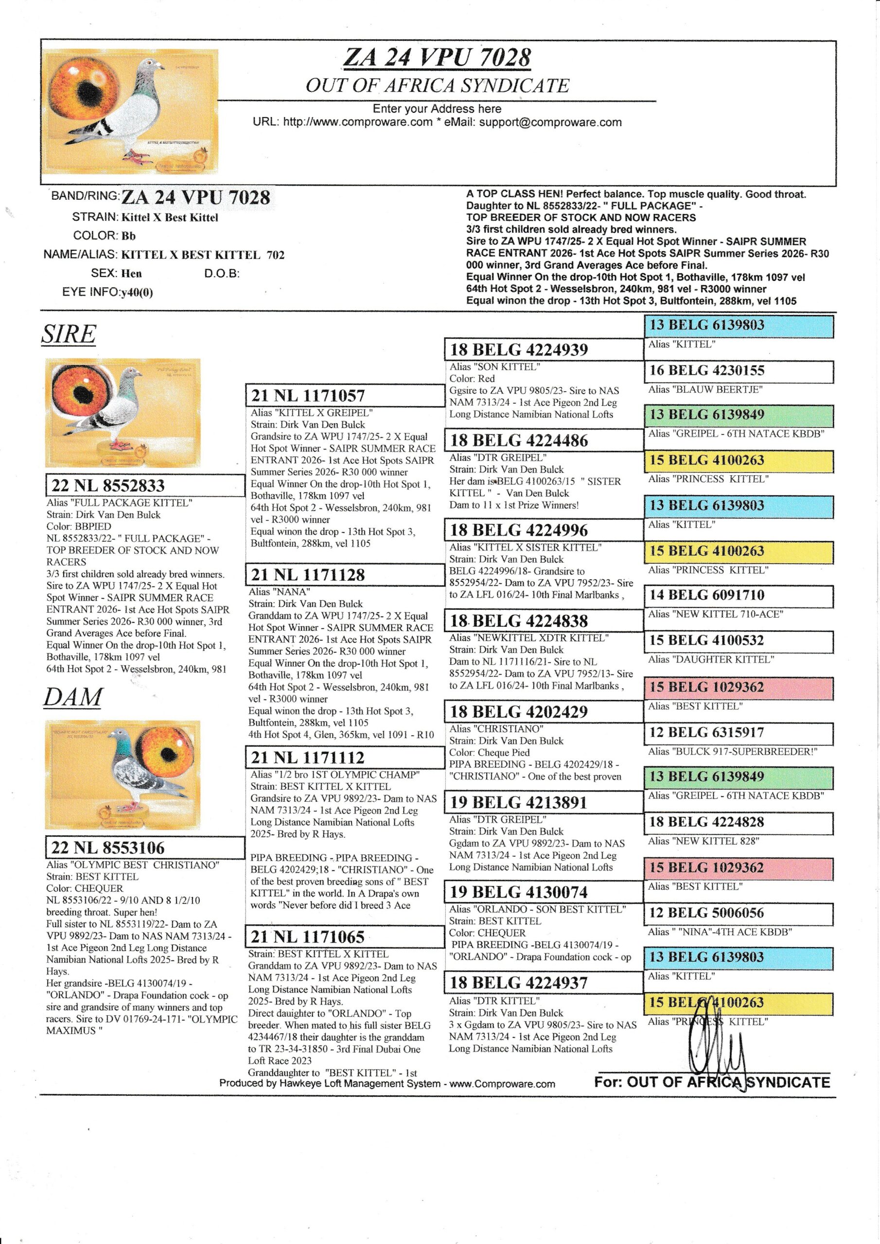 LOT 1: ZA VPU 7028/24 (H) – “ KITTEL X BEST KITTEL 702 “ – ½ Sister on sire side to ZA WPU 1747/25- 2 X Equal Hot Spot Winner – SAIPR SUMMER RACE ENTRANT 2026- 1st Ace Hot Spots SAIPR Summer Series 2026- R30 000 winner, 3rd Grand Averages Ace before Final. Her dam is NL 8553106/22 – Full sister to NL 8553119/22- Dam to ZA VPU 9892/23- Dam to NAS NAM 7313/24 – 1st Ace Pigeon 2nd Leg Long Distance Namibian National Lofts 2025- Bred by R Hays. As I can breed another I have decided to offer her from our own stock loft A TOP CLASS HEN! Perfect balance. Top muscle quality. Good throat. Daughter to NL 8552833/22- ” FULL PACKAGE” – NEW SUPERBREEDER OF STOCK AND NOW ACE PIGEONS! 3/3 first children sold already bred winners. – SEE PEDIGREE !!!