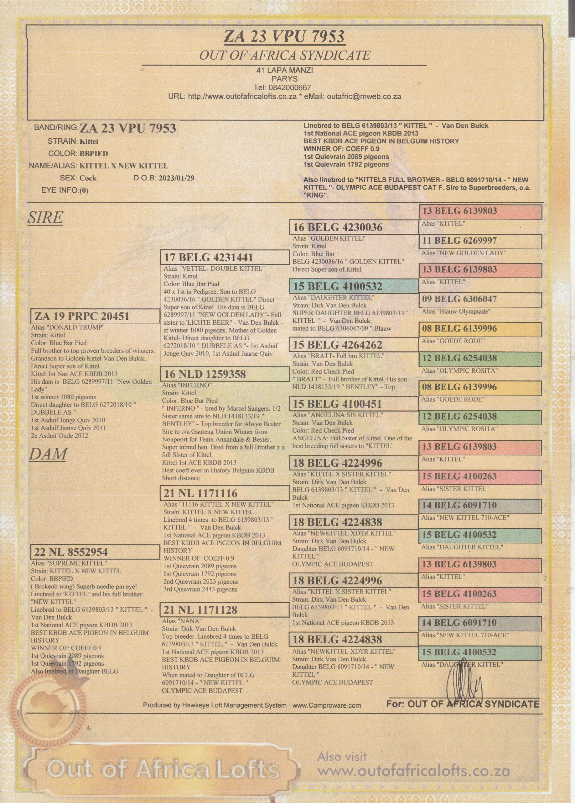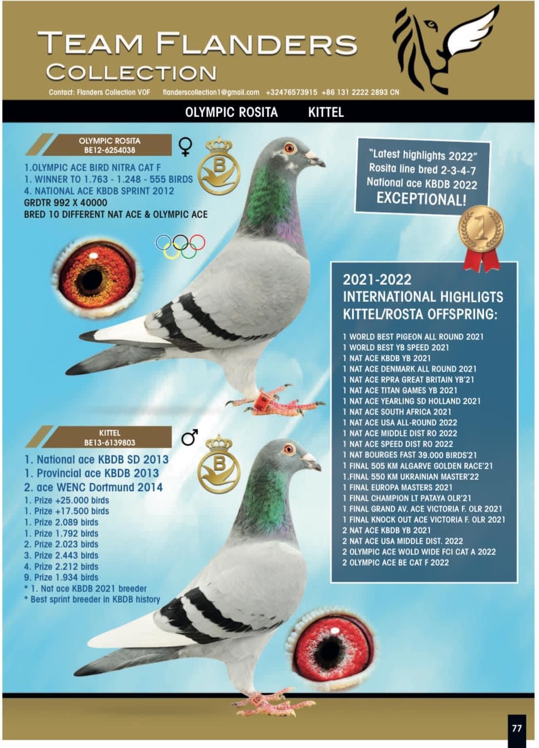 Son to BELG 4230710/16- ” NEW KITTEL “- Sire to Hot Spot & Car Race Winner SAMDPR 2019 – 2582 pigeons’
