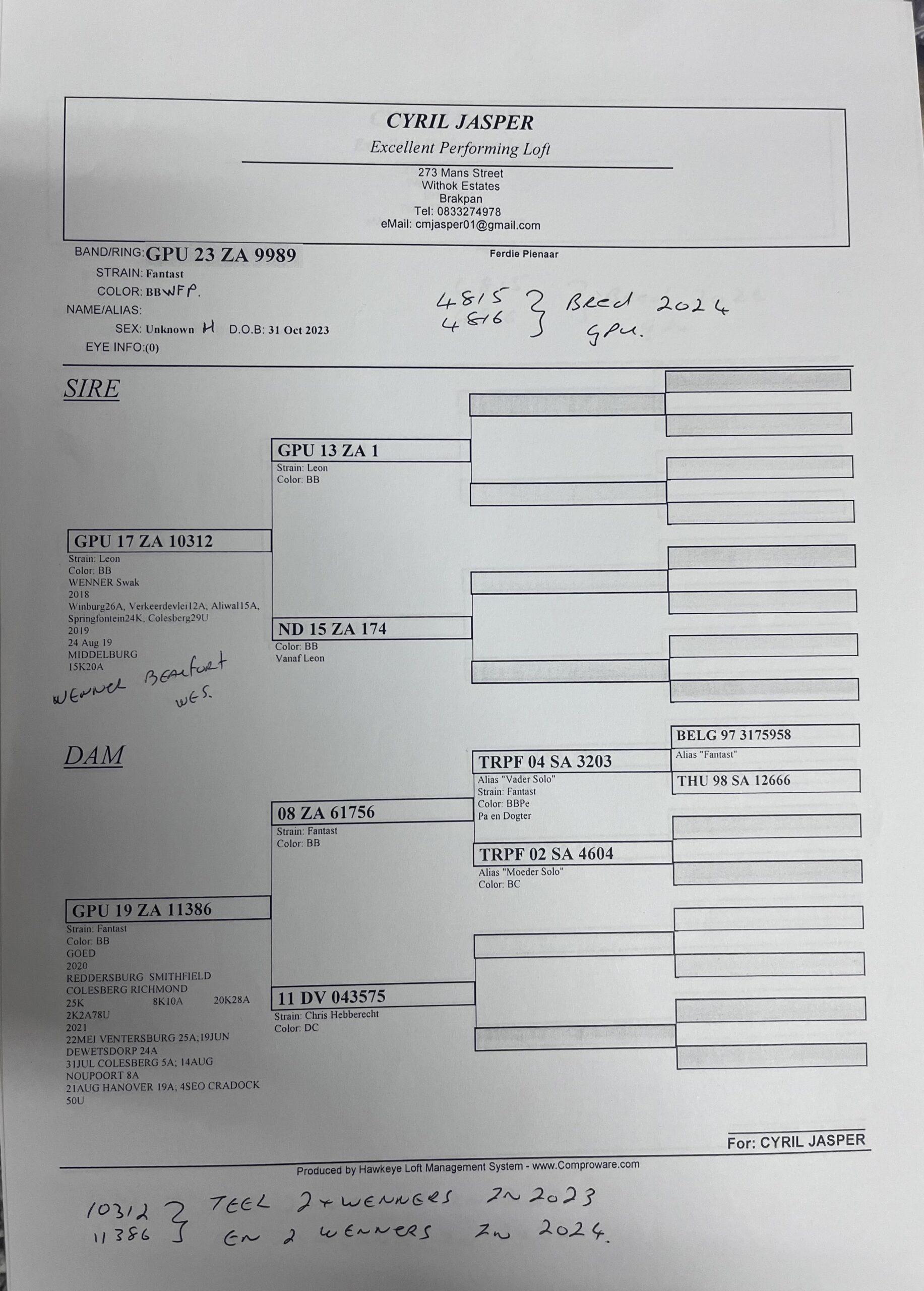 STUDY THE PEDIGREE WELL – THIS PIGEON IS BRED FROM THE VERY BEST RACERS