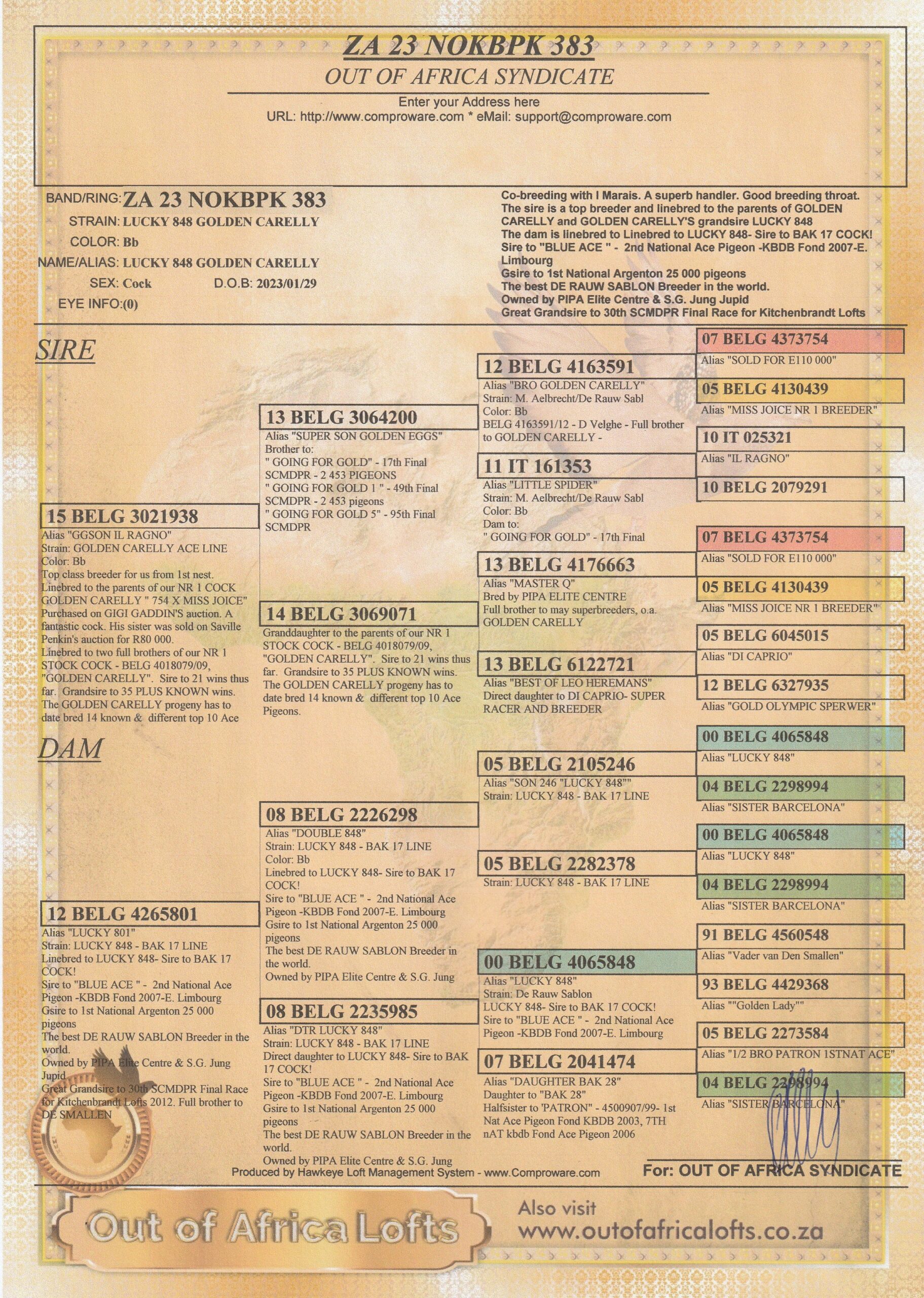 Top breeder and linebred to the parents of GOLDEN CARELLY , BELG 4373754/07 & MISS JOICE BELG 4130439/05 and GOLDEN CARELLY’S grandsire LUCKY 848