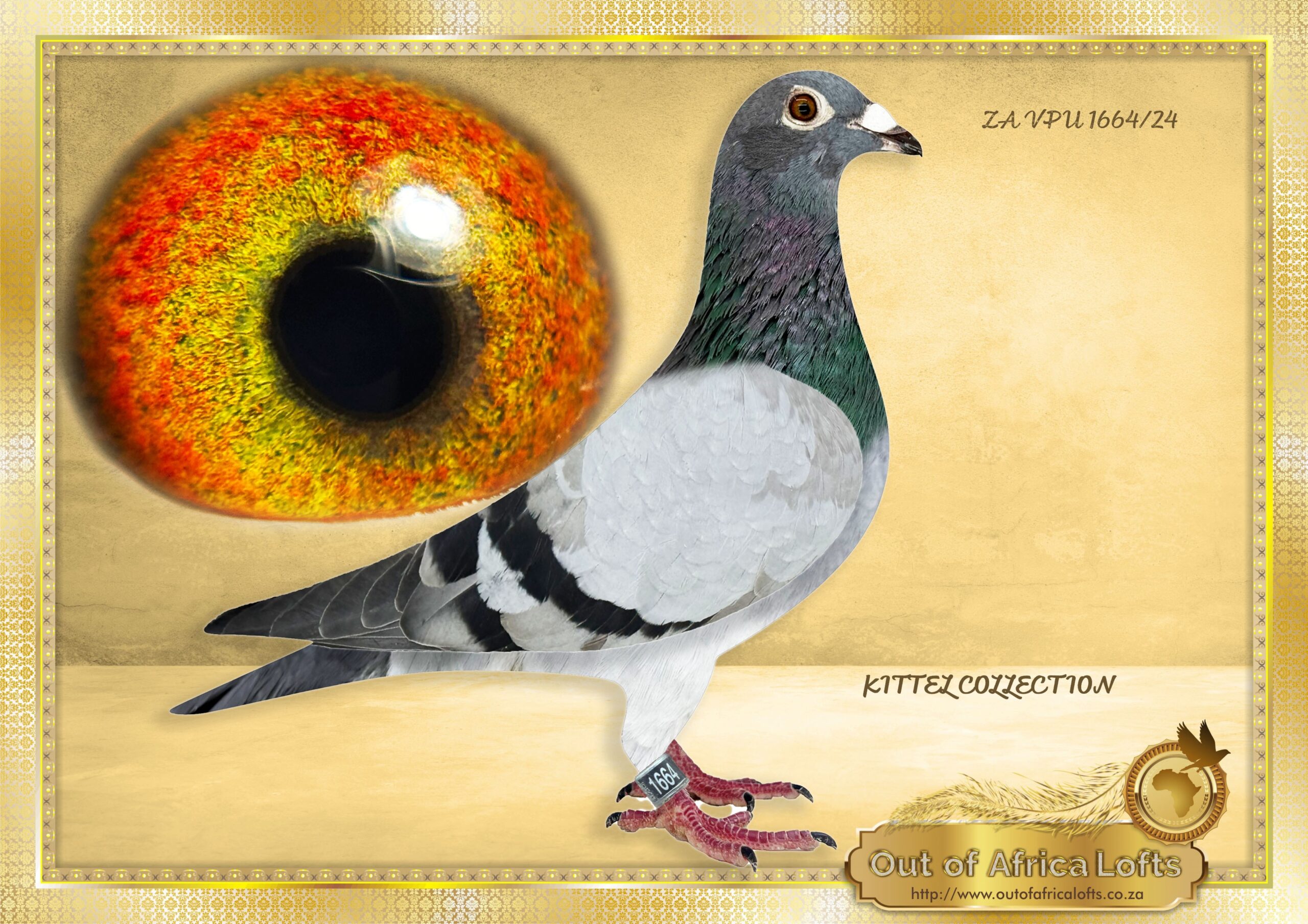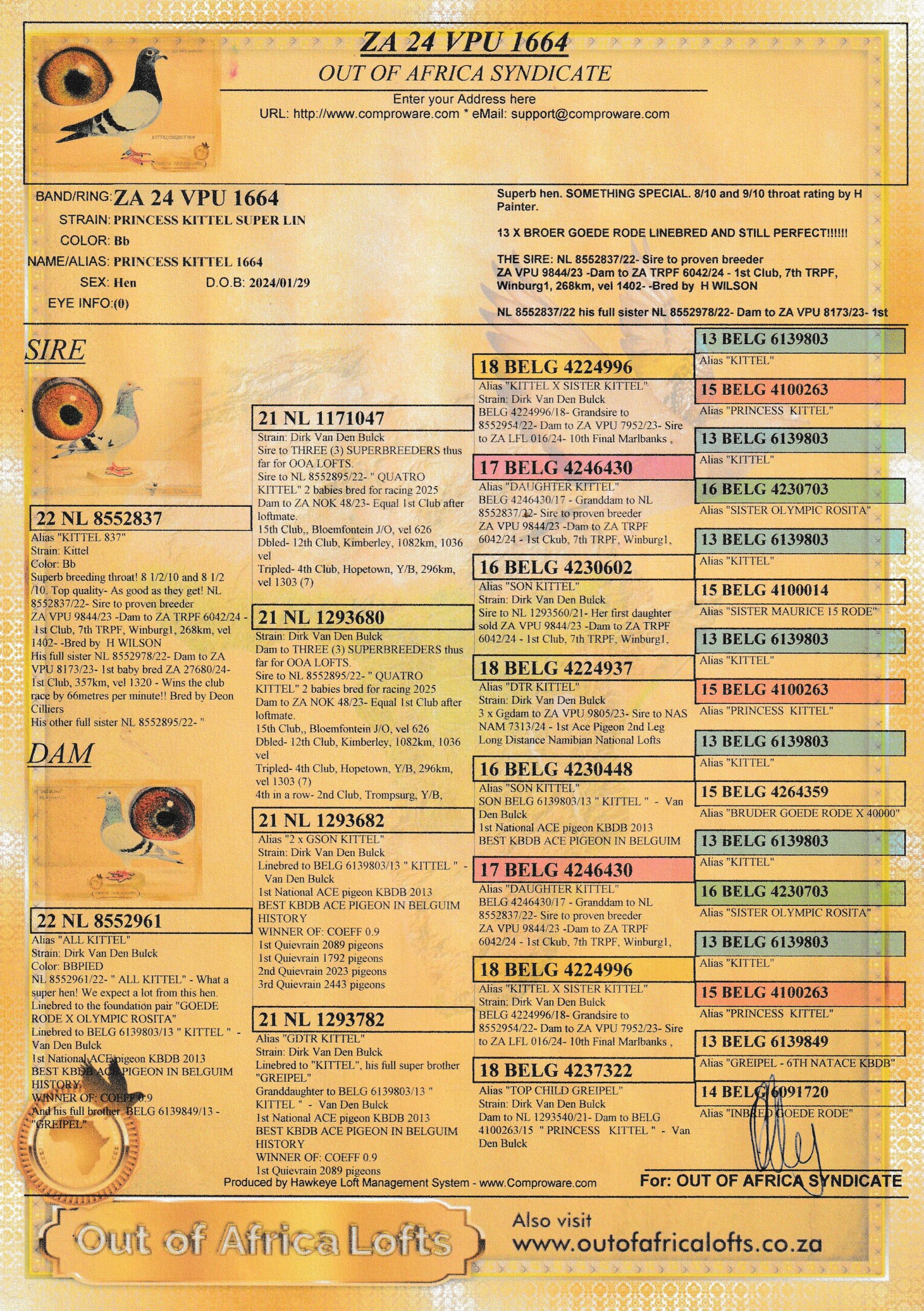 LOT 2: ZA VPU 1664/24 (H) – “ PRINCESS KITTEL “ ***** HIGHLY RECOMMENDED ***** Our “PRINCESS KITTEL LINE “ bred 7 different top 10 Ace Pigeons in 2025 season for different fanciers. Our “PRINCESS KITTEL LINE” has proven in the SAIPR SUMMER SERIES 2026 that they can compete and beat the best in S.A. This same line bred ZA WPU 1747/25- 2 X Equal Hot Spot Winner – SAIPR SUMMER RACE ENTRANT 2026- 1st Ace Hot Spots SAIPR Summer Series 2026- R30 000 winner, 3rd Grand Averages Ace before Final – THE SIRE: NL 8552837/22- Sire to proven breeder ZA VPU 9844/23 -Dam to ZA TRPF 6042/24 – 1st Club, 7th TRPF, Winburg1, 268km, vel 1402- -Bred by H WILSON – Linebred to BELG 4100263/15 ” PRINCESS KITTEL ” – Van Den Bulck. 7 Ggchidlren bred winners for clients thus far. – SEE PEDIGREE !!!