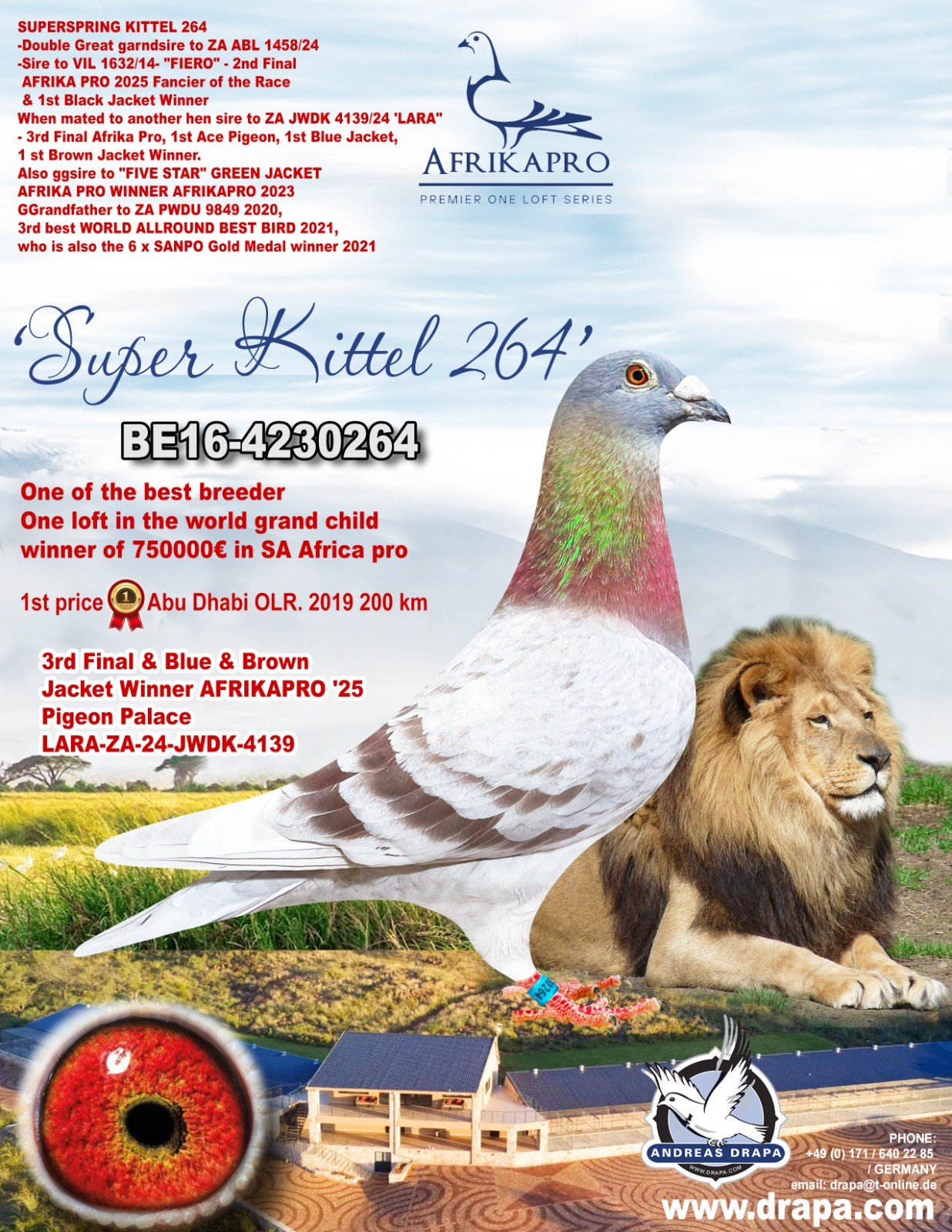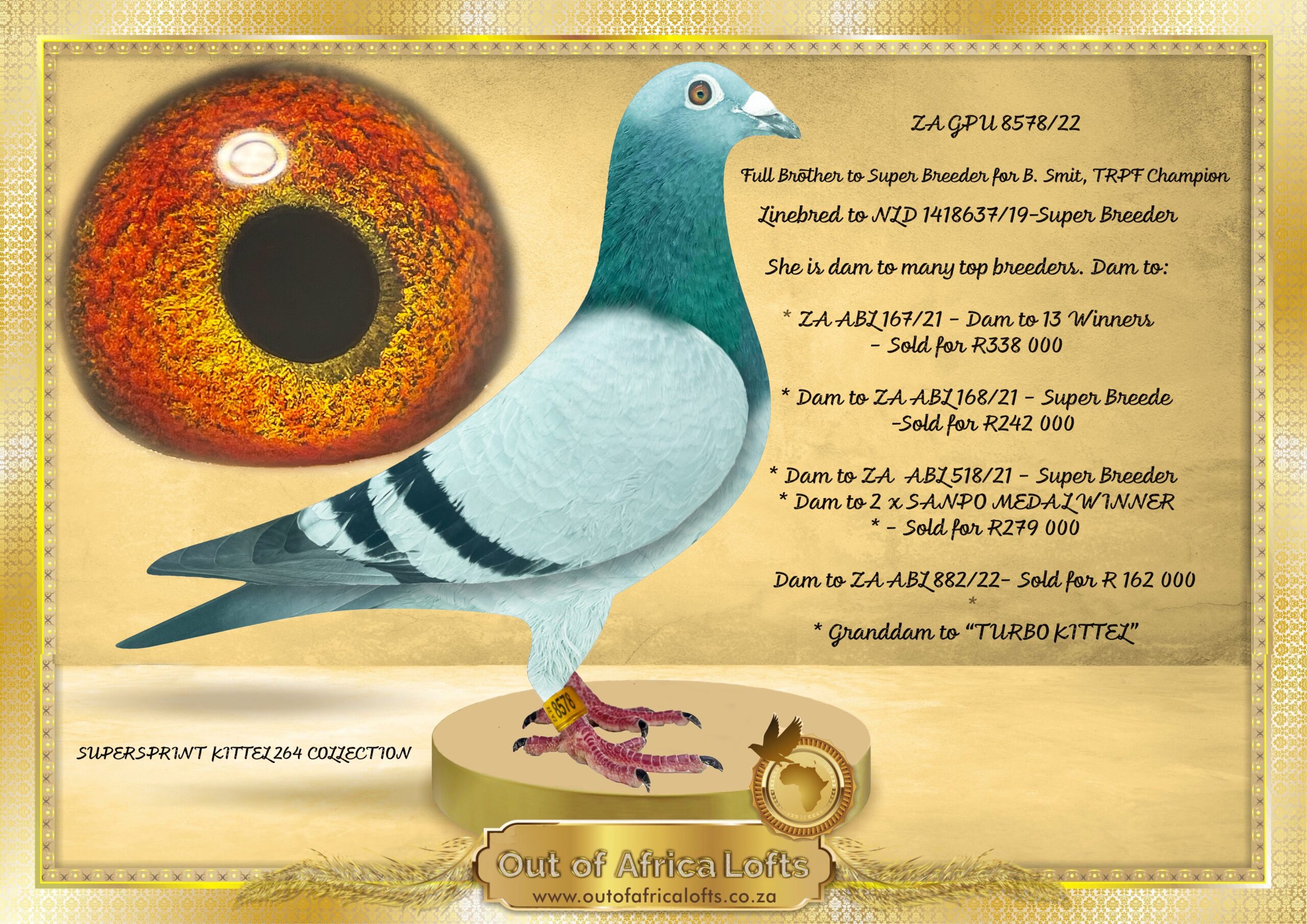 Sire and Grandsire to Sire to ZA ABL 1458/24- Sire to VIL 1632/14- “FIERO” – 2nd Final AFRIKA PRO 2025- Fancier of the Race & 1st Black Jacket Winner