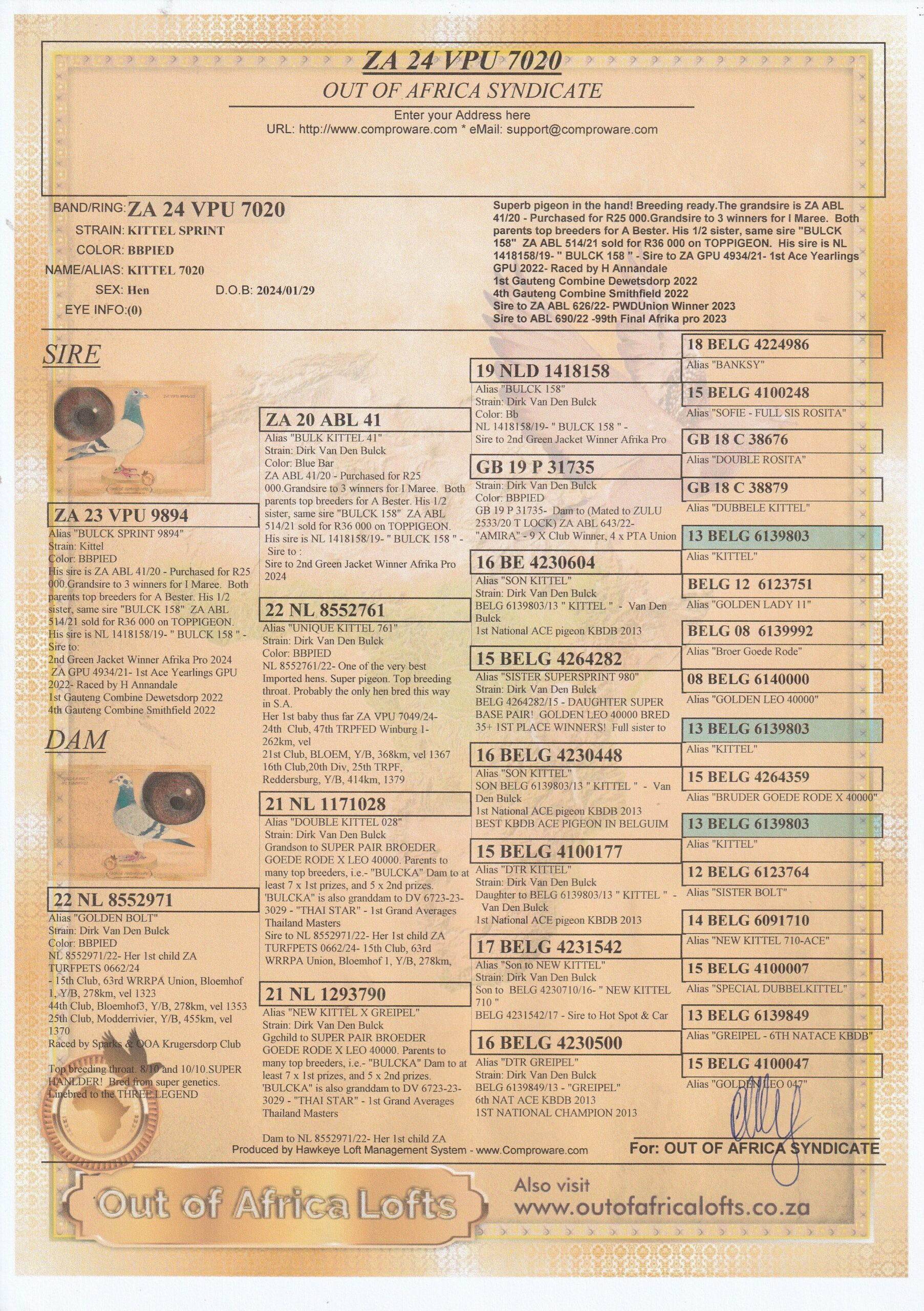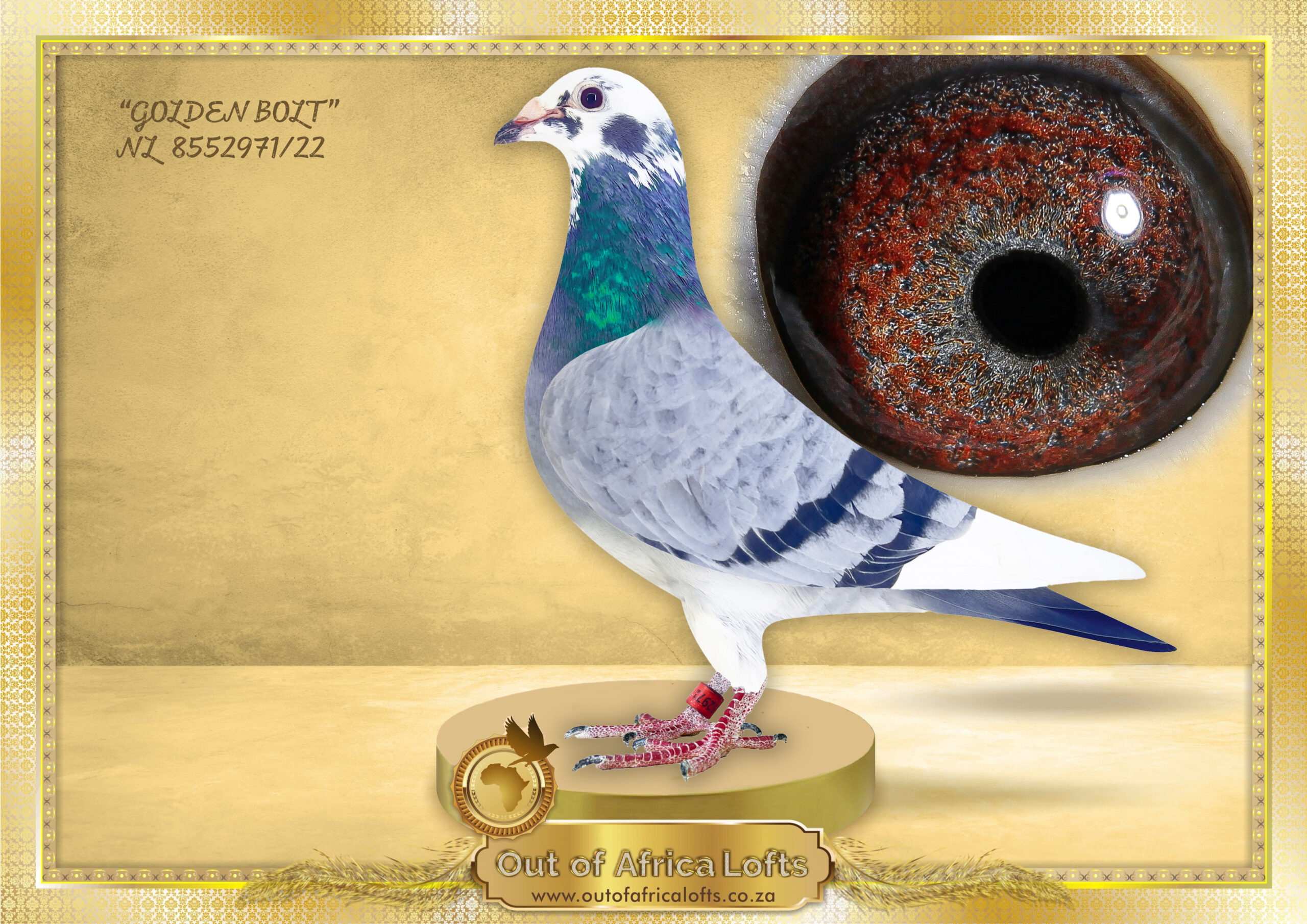 GB 19 P 31735- Dam to (Mated to ZULU 2533/20 T LOCK) ZA ABL 643/22- “AMIRA” – 9 X Club Winner, 4 x PTA Union Winner! SANPO GOLD OVERALL DISTANCE (2001 + PIGEONS 2024), SANPO SILVER MEDAL MIDDLE DISTANCES (2001+ PIGEONS 2024