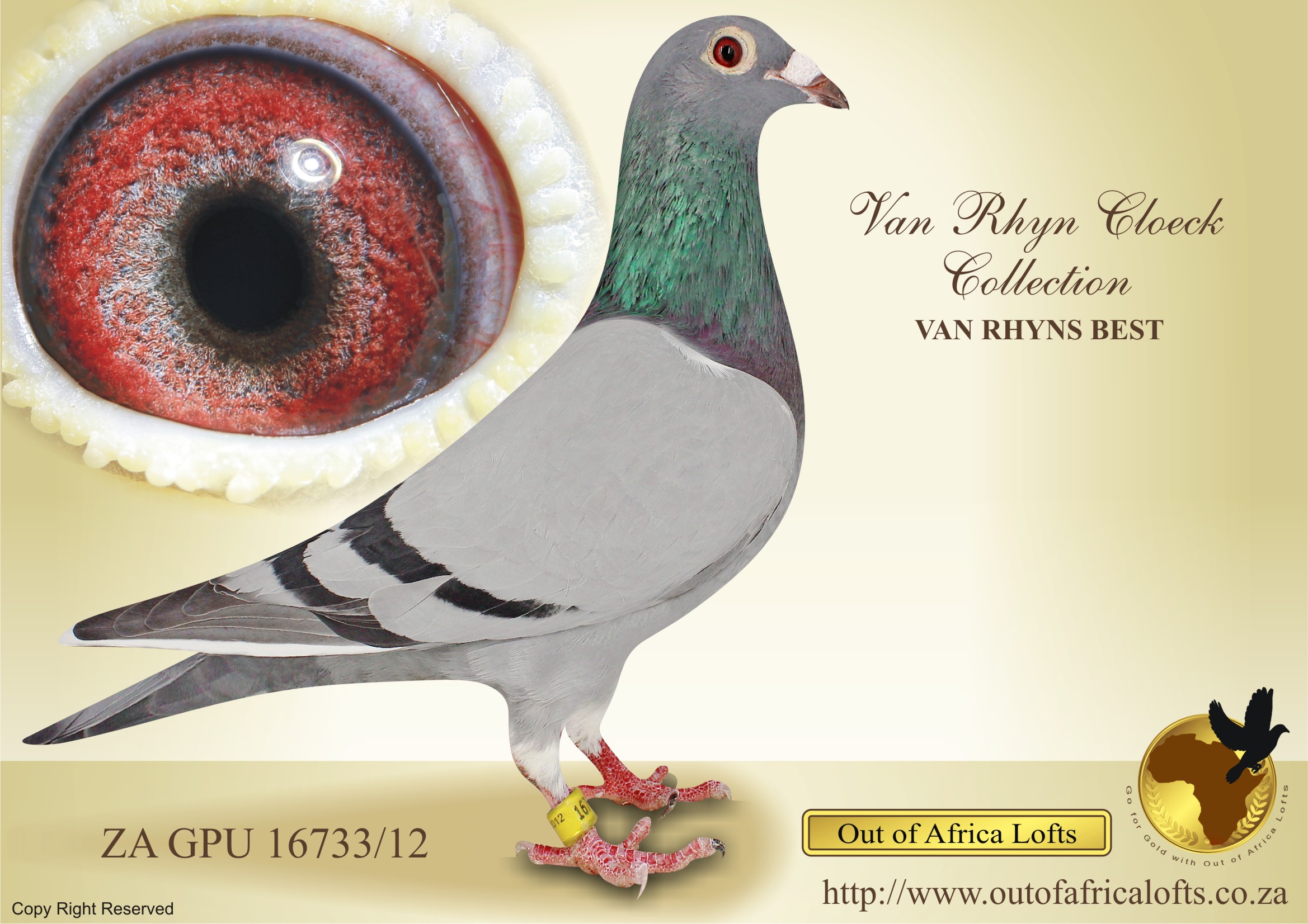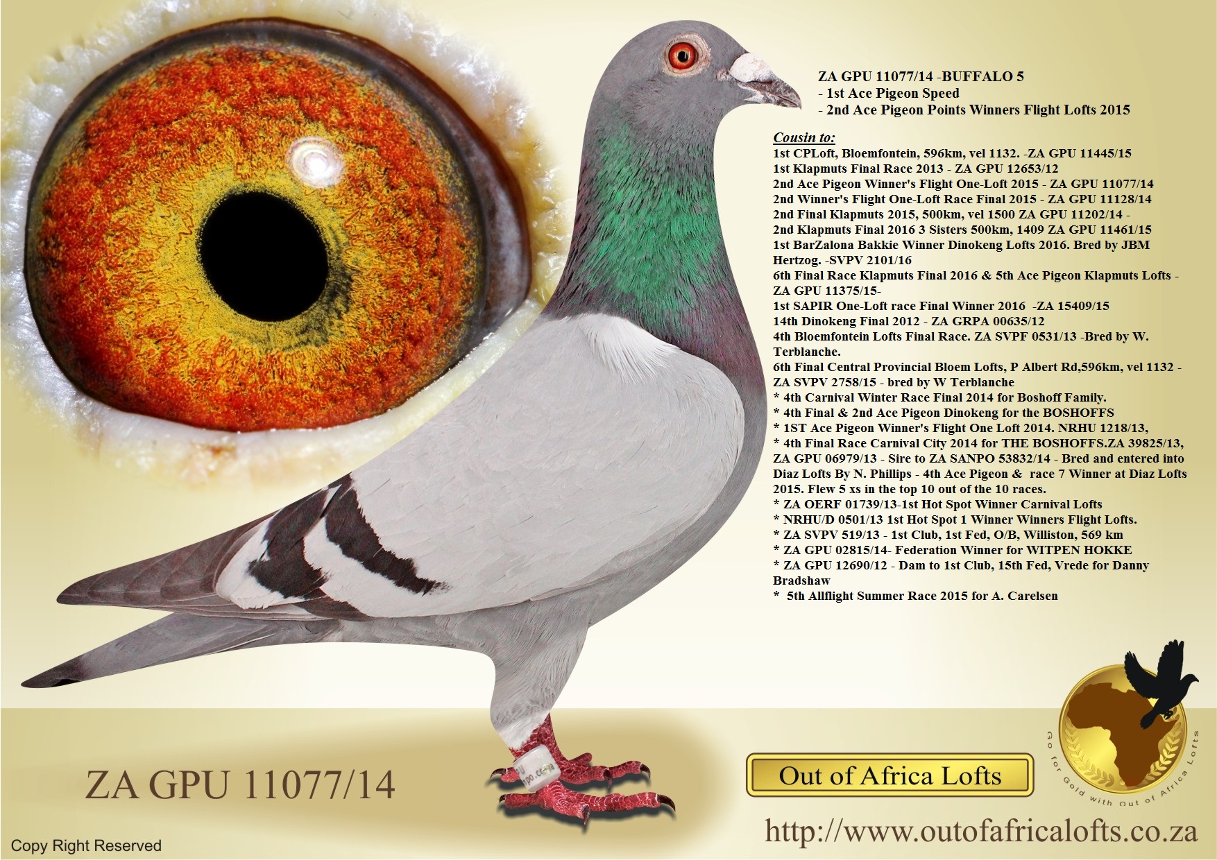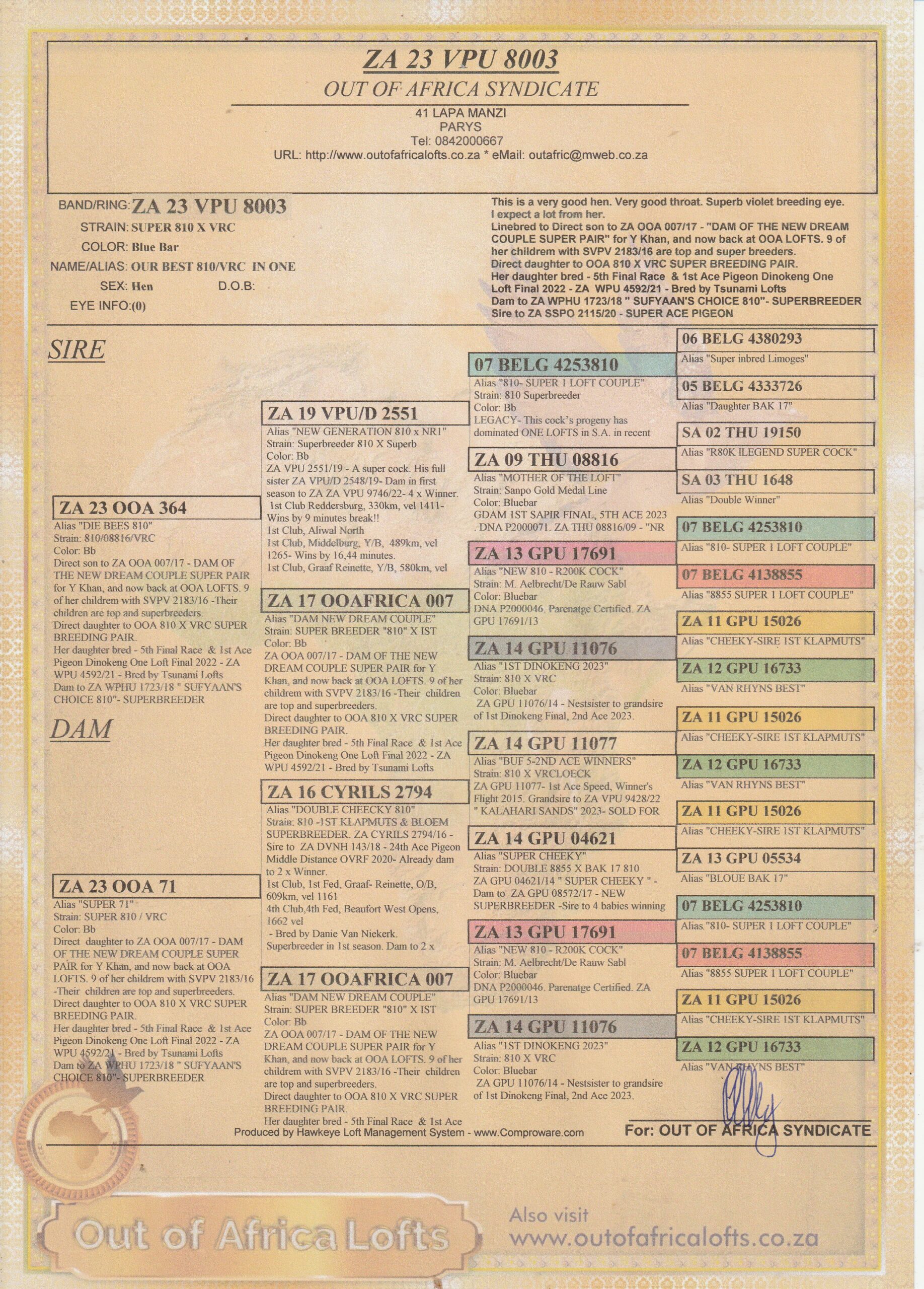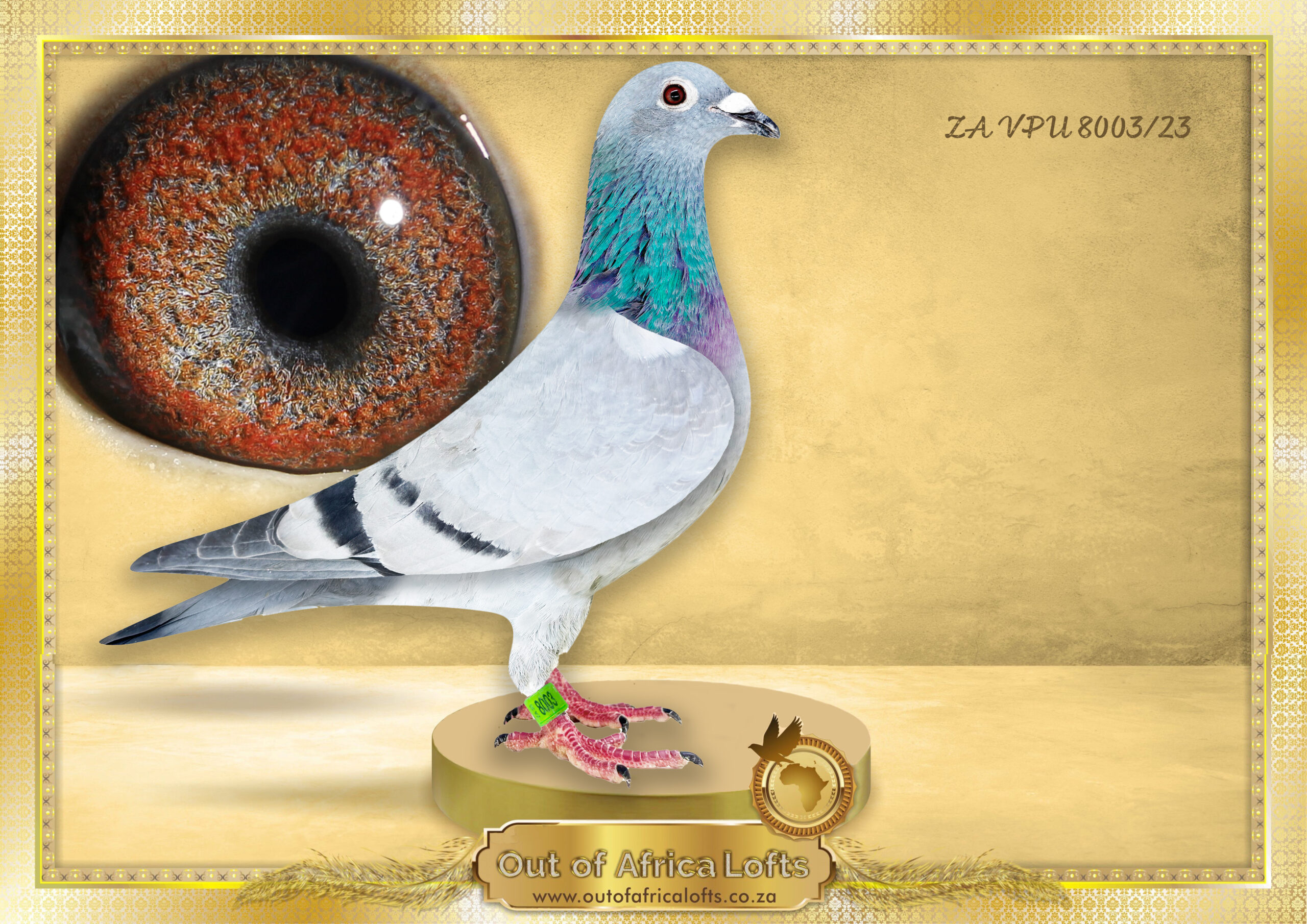 Grandsire to ZA GPU 05439/17 – top breeder for new client Dane Pietersen.Dam to ZA PPS 7234/19 – 7th Cradock One Loft Final, 814 km. Dam to ZA PPS 1354/19 -2nd ACE Dinokeng One Loft Race- Bred and raced by D Pietersen Family Lofts.