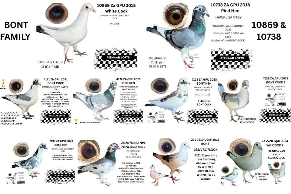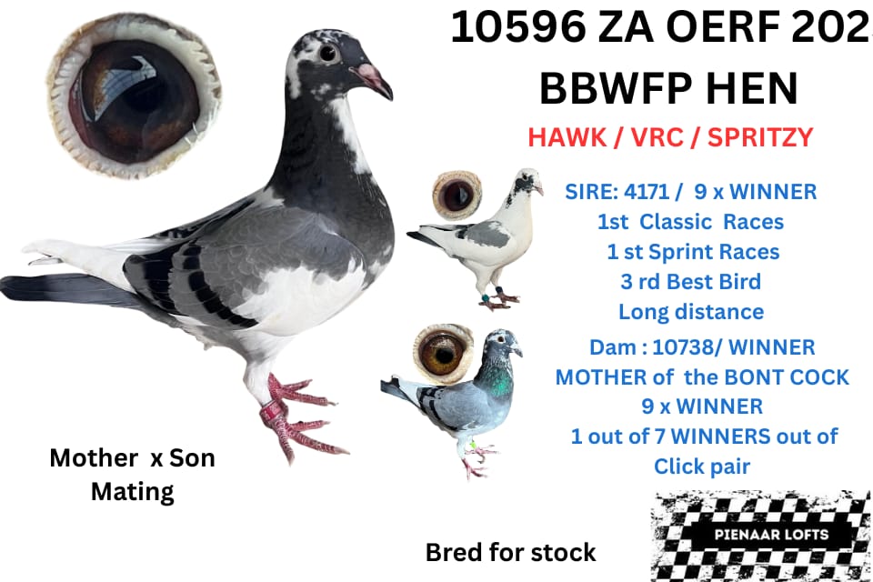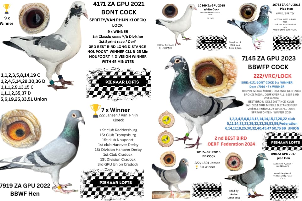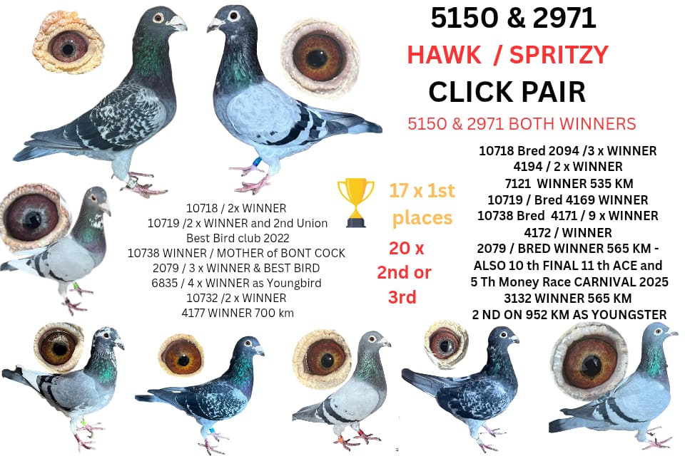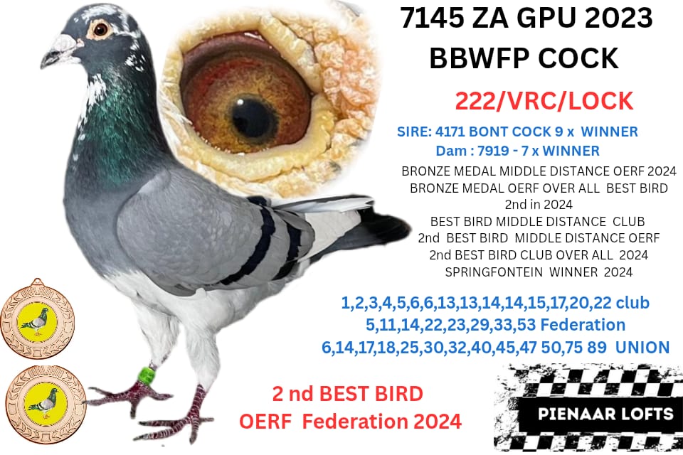 BRED FOR STOCK ,FATHER 9 X WINNER /SPRINT WINNER/CLASSIC WINNER / NOUPOORT WINNER WITH 25 MIN/AND AGAIN NOUPOORT WITH 45 MIN /3RD BEST LONG DISTANCE CLUB / MOTHER IS 1 OF 7 CURRENT WINNERS OUT OF CLICK PAIR 7145 H/BROTHER 2 X BRONZE MEDAL OERF 2024 BEST BIRD MIDDLE DISTANCE CLUB AND 2ND BEST YERLING OERF 2024 OVER ALL