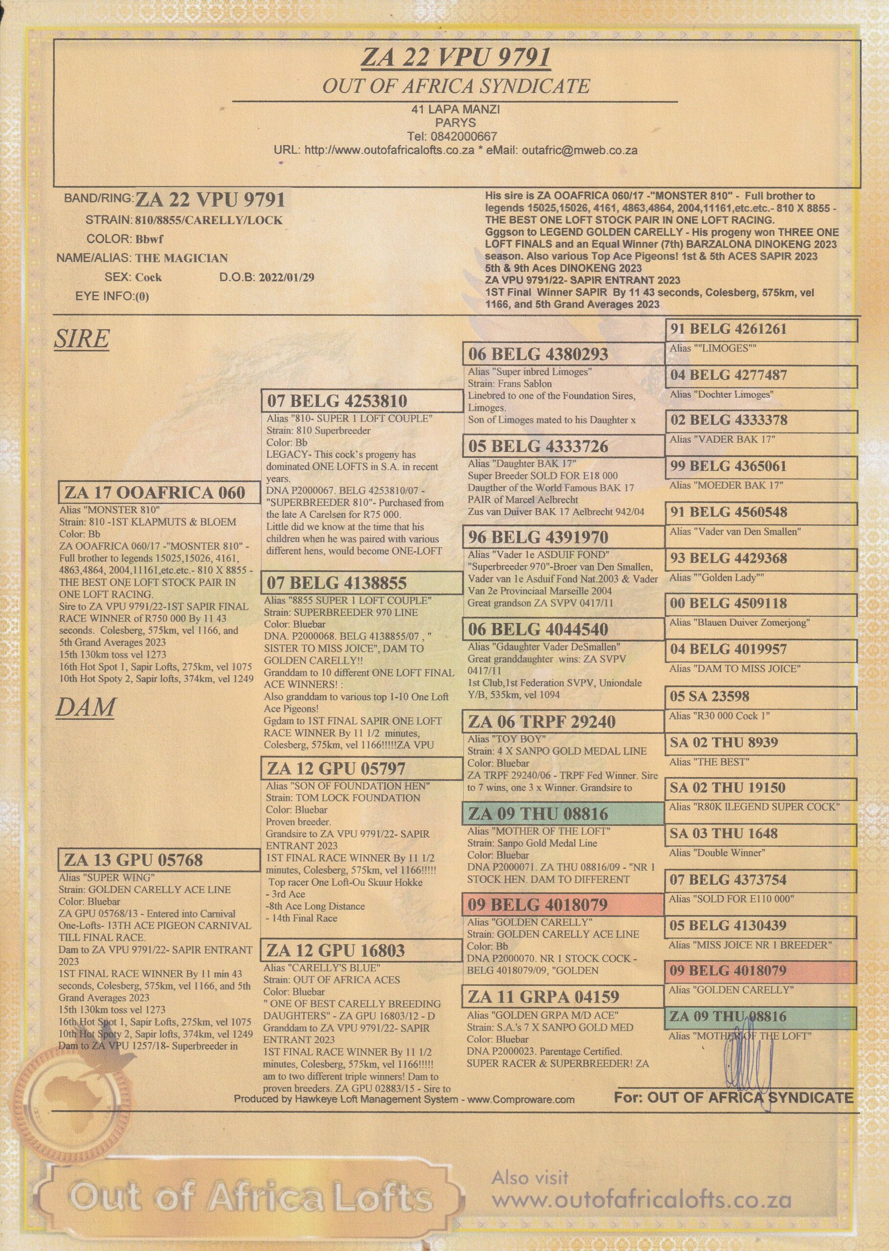 Sire to ZA VPU 1270/18 – Dam to ZA OOA 81/19 -SUPERBREEDER. Sire to TROS 1279/21- 1st Club, 1st Union, Hopetown, 435km, vel 1163. Won the race by 1,5 miutes.