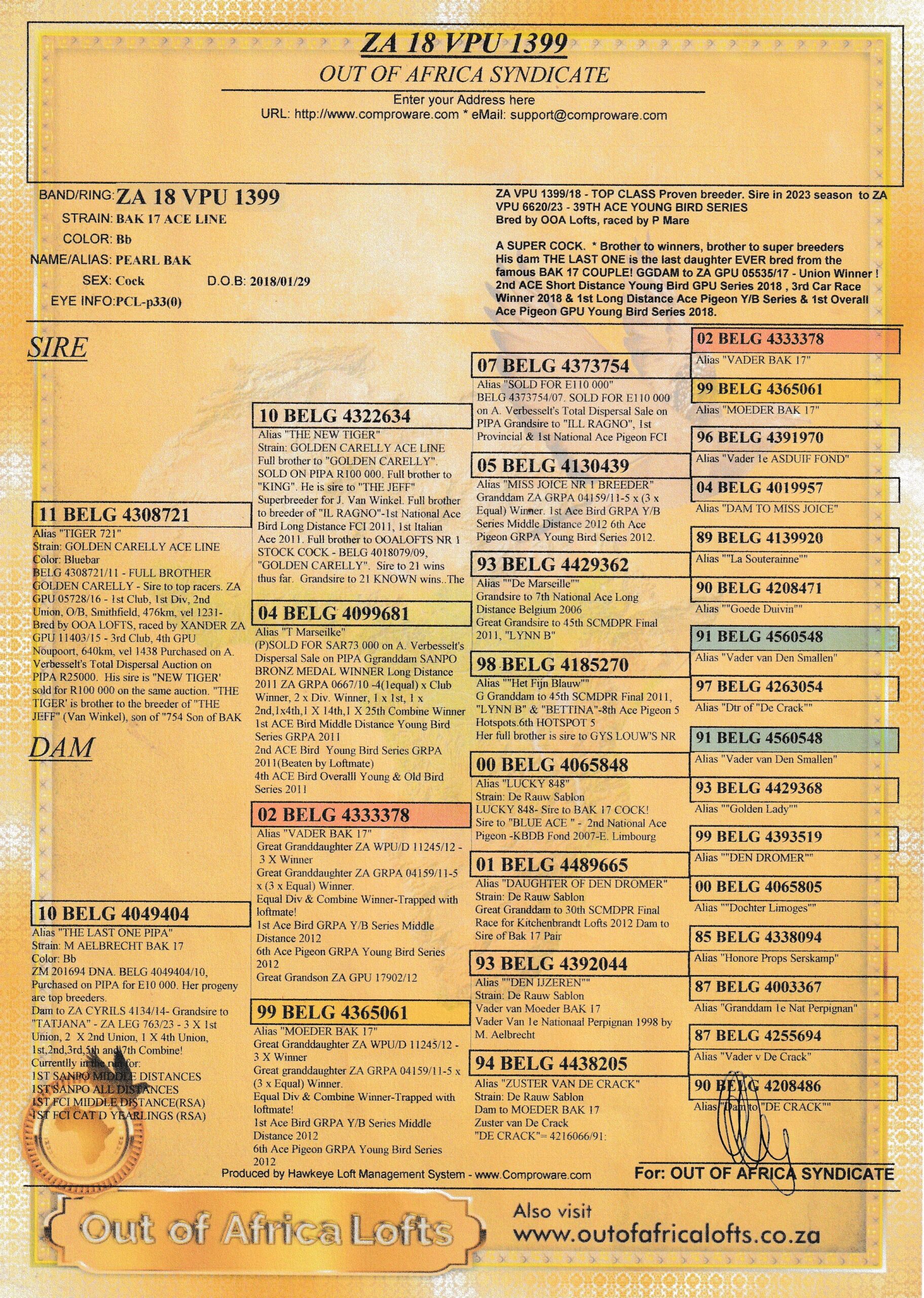 LOT 7: ZA VPU 1399/18 “ PEARL BAK “ A RARE OPPORTUNITY to purchase a direct son of TWO IMPORTED SUPER BREEDERS FOR US. – TOP CLASS Proven breeder. Again Sire in 2023 season to ZA VPU 6620/23 – 39TH ACE YOUNG BIRD SERIES Bred by OOA Lofts, raced by P Mare A SUPER COCK. * Brother to winners, brother to super breeders His dam THE LAST ONE is the last daughter EVER bred from the famous BAK 17 COUPLE! BELG 4049404/10, Purchased on PIPA for E10 000. Her progeny are top breeders – SEE PEDIGREE !!!