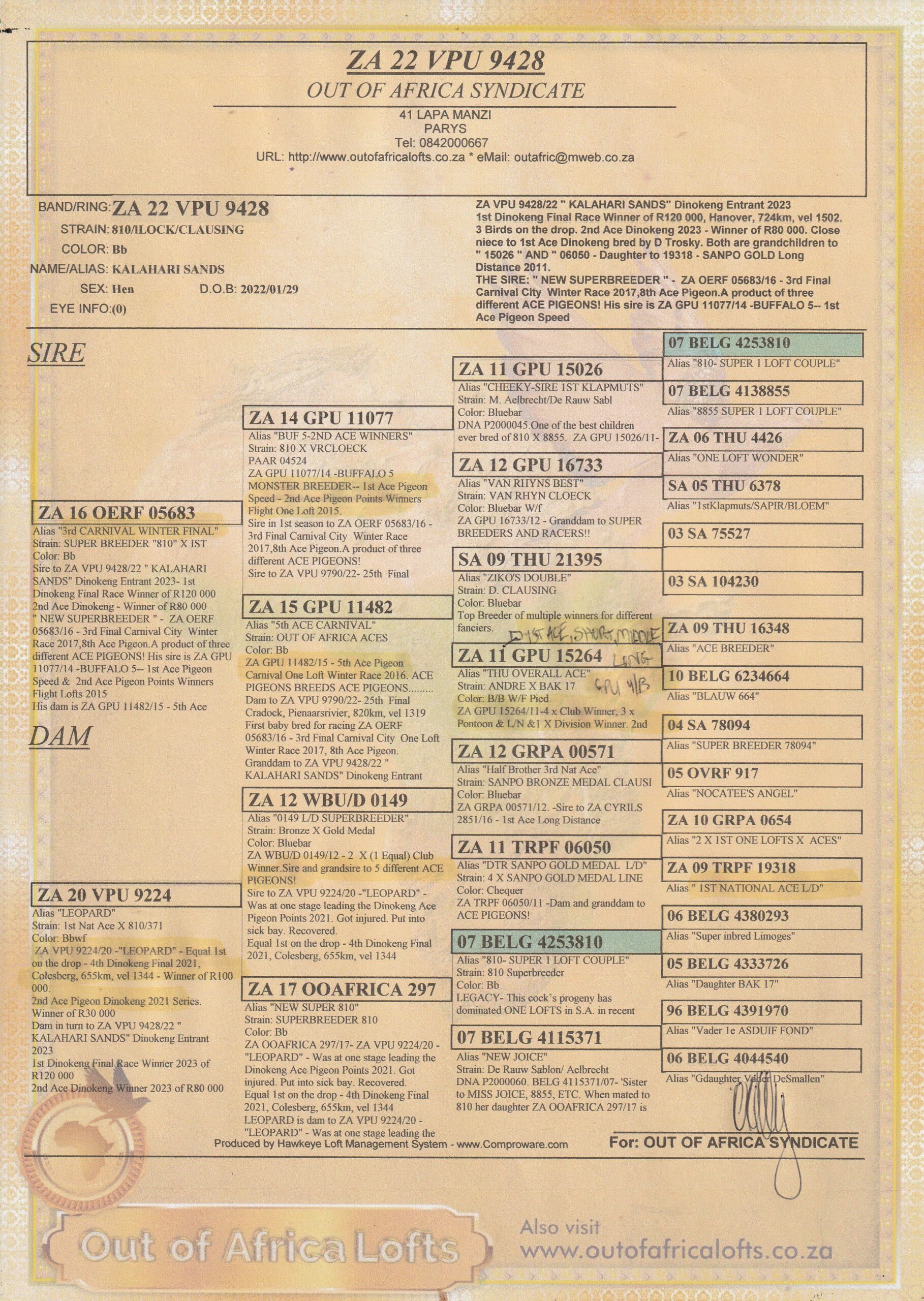 SA THU 21395/09- Sire to o.a.  ZA GPU 15838/11-3 x Winner (1 x Equal) Club, Division & Combine Winner. 2nd Overall ACE Pigeon O/B Series GPU 2013.