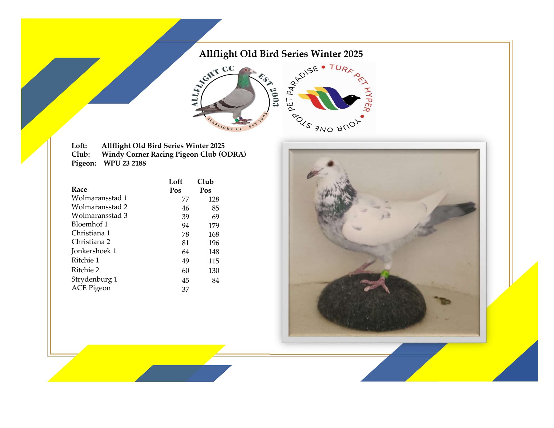 THE SIRE: Bought from Rudolph Holtzhauzen for stock Bred 5th Ace Winnersflight Bred Winner 626km Freat Fish Bred 12th Main Diaz