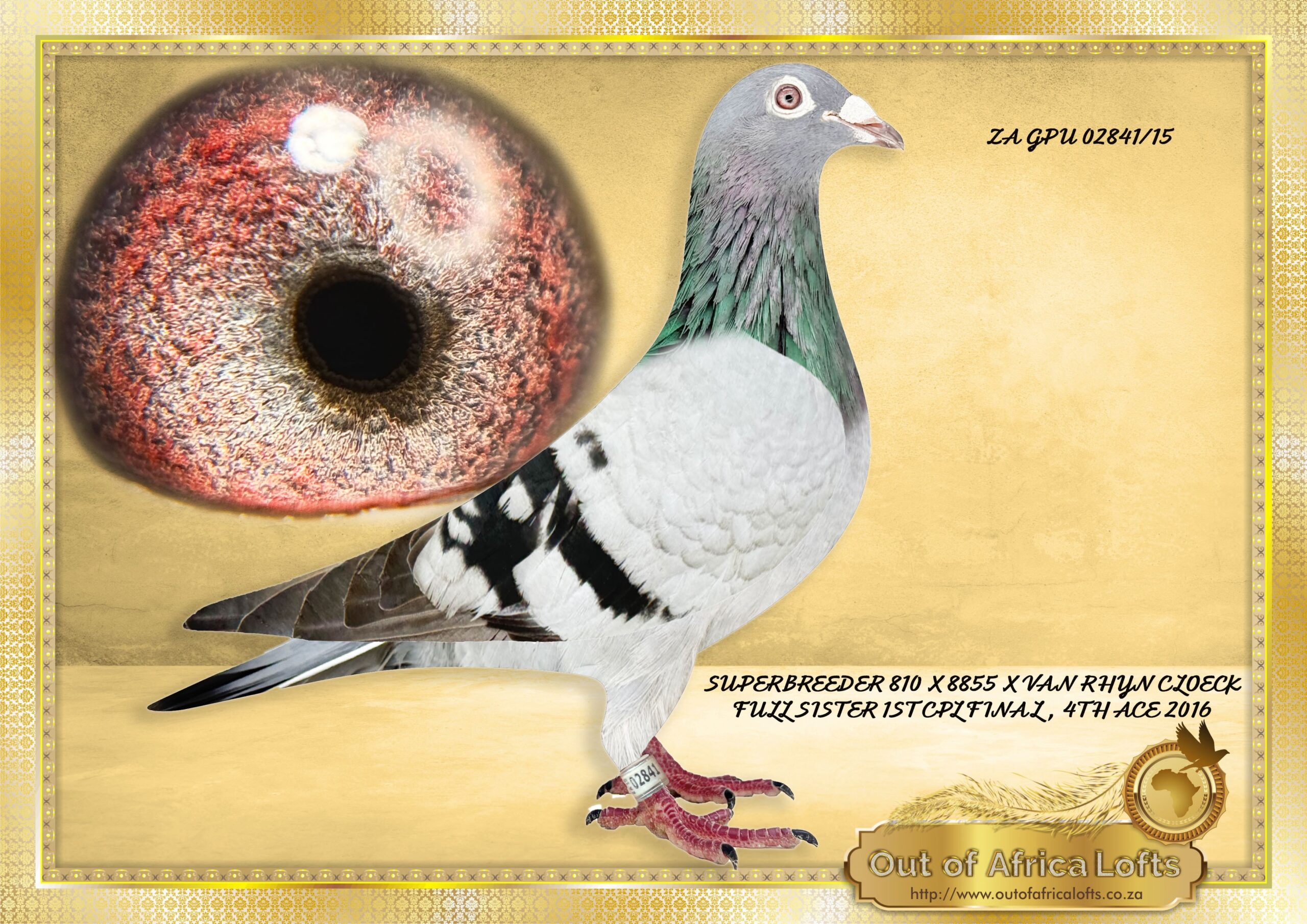 Full sister to ZA GPU 11445/15 – 1st Central Provincial Loft, Bloemfontein, 596km, vel 1132 & 4th Ace Pigeon CPL Bloemfontein