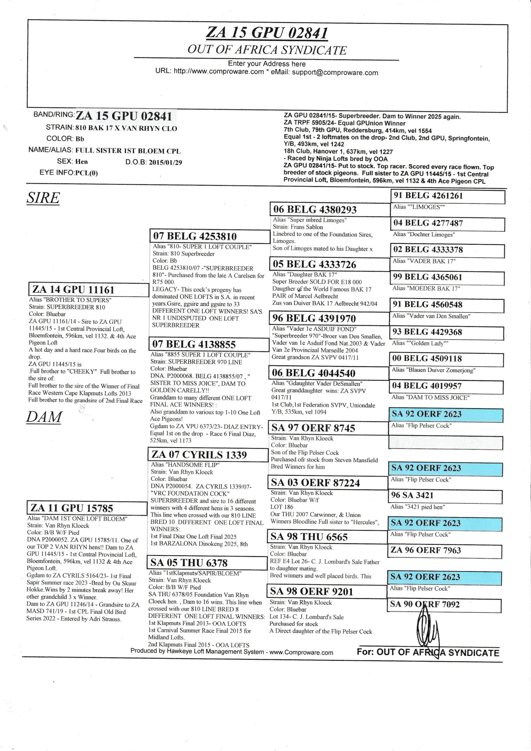 Gsire to ZA GPU 08531/17 – NEW TOP BREEDER Clicks wit 2 different cocks. Dam to ZA GPU 05526/16- Sire to ZA VPU 8186/23- Dam to ZA FB 09549/24- 3rd Final, 31st Ace Pigeon Capetown International Final 2025